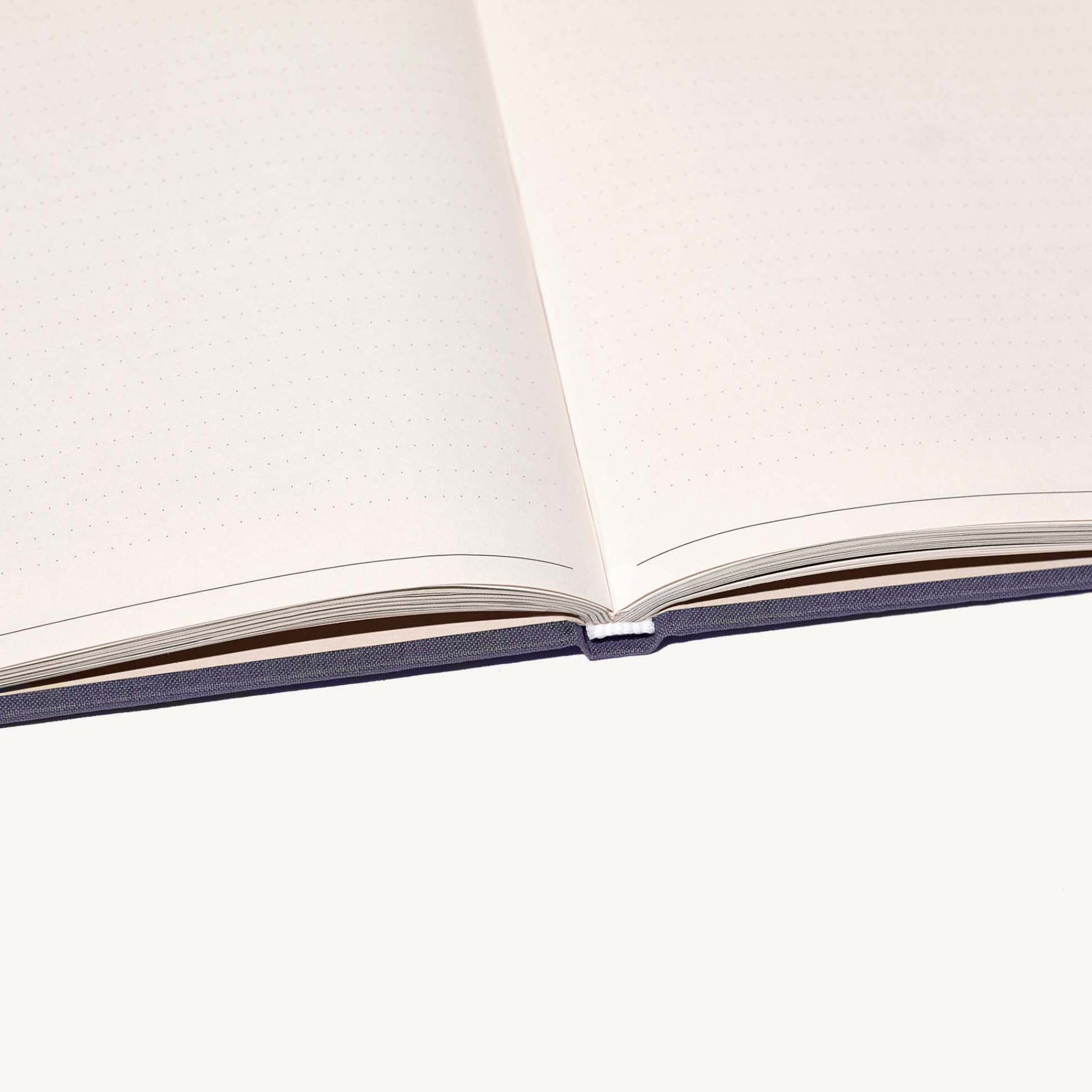 Full angled view of The Anti-Insomnia Notebook by Therapy Notebooks, featuring a linen hardcover with a minimalist stitched patch.